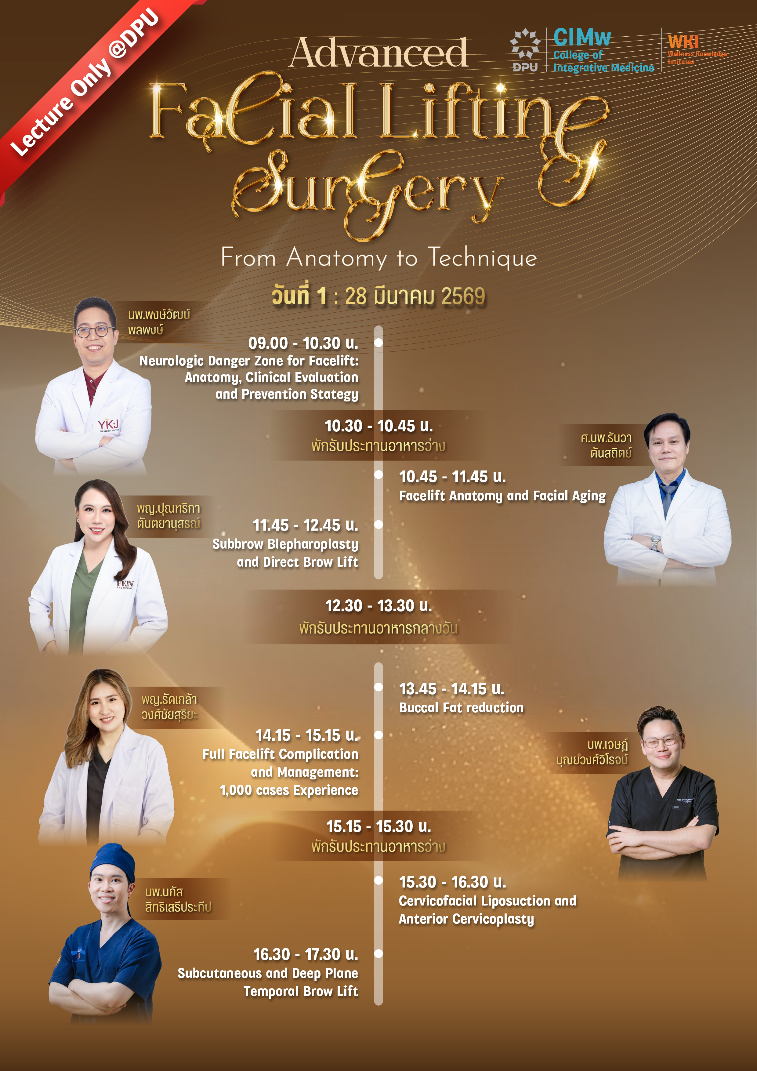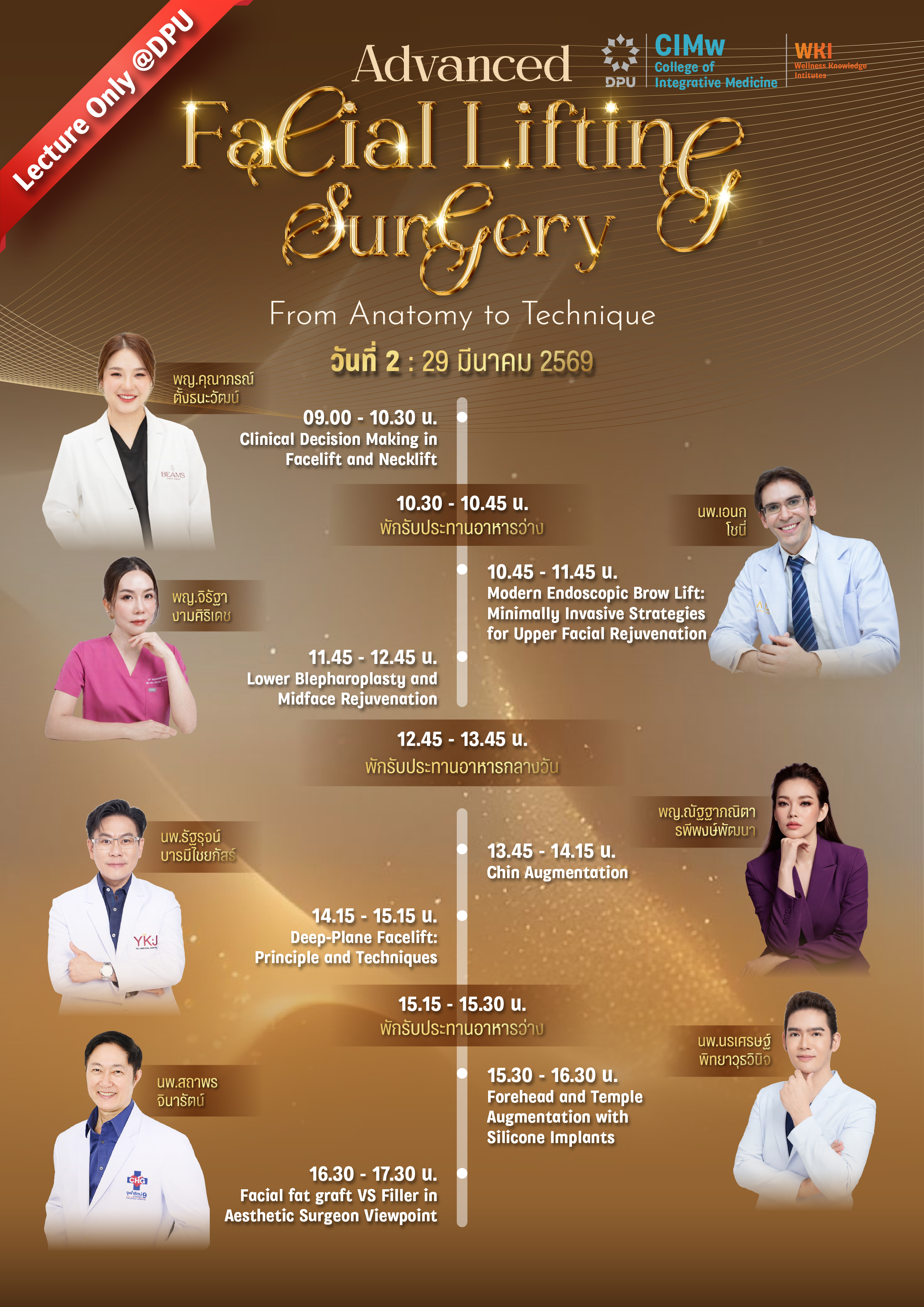 เล็งเห็นถึงความสำคัญของการพัฒนาทักษะทางศัลยกรรมความงามให้เป็นไปตามมาตรฐานวิชาชีพและความปลอดภัยสูงสุด จึงกำหนดจัดโครงการอบรมวิชาการ “Advanced Facial Lifting Surgery : From Anatomy to Technique ” ขึ้นเพื่อเสริมสร้างศักยภาพให้แก่แพทย์ในการผ่าตัดดึงหน้าและปรับโครงสร้างใบหน้าอย่างครบวงจร