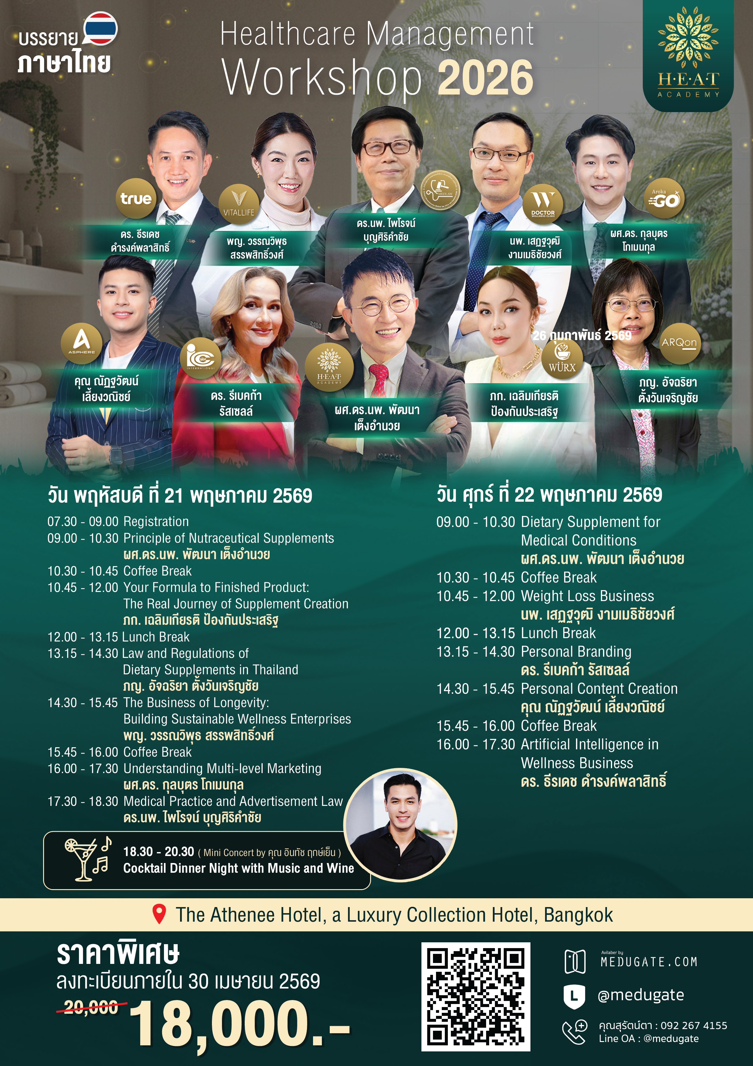 หัวข้อเข้มข้น: การพัฒนาสูตรเสริมอาหารสู่ผลิตภัณฑ์จริง, กฎหมายและระเบียบผลิตภัณฑ์สุขภาพ, กลยุทธ์สร้างธุรกิจเวชศาสตร์ชะลอวัย, การตลาดคอนเทนต์–Personal Branding, ธุรกิจควบคุมน้ำหนัก, AI ในธุรกิจสุขภาพ และอีกมากมาย